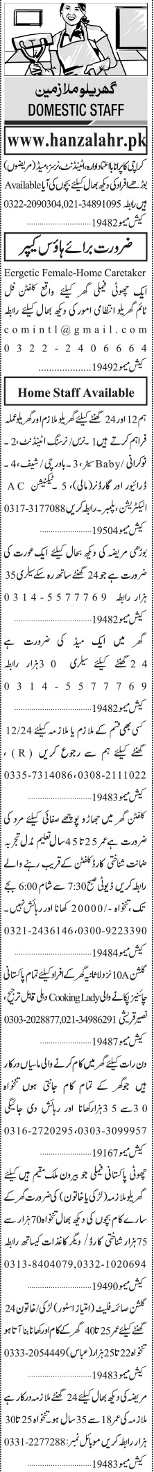 House Karachi, karachi Sindh Pakistan invites applications from eligible candidates for the post of attendant, nursing attendant, cleaner, aya, cook, driver, ltv driver, gardener, chef, sweeper, plumber, electrician, chinese chef, masi, house maid, babysitter, home caretaker, nurse, ac technician, maid, mali and house keeper as per advertisement of June 20, 2022 published in daily Jang Newspaper. Matric, Middle and Primary etc. educational qualification will be preferred.