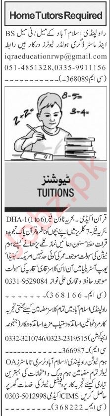 Jang Sunday Classified Ads 19 March 2023 For Home Tutor