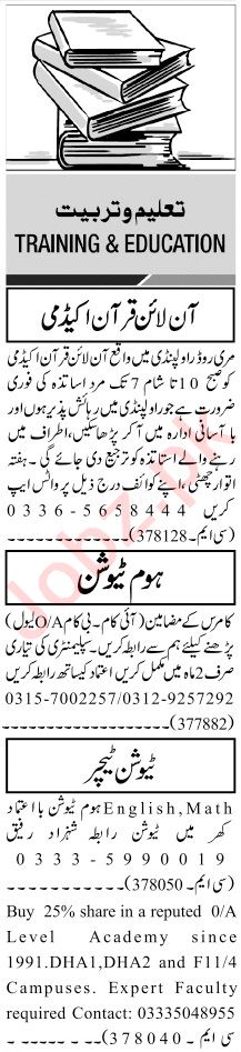 Vacant posts including teacher, a level teacher, home tutor, quran teacher and o level teacher are announced in Academy Islamabad, islamabad Islamabad Pakistan as per 20 November 2023 advertisement in daily Jang Newspaper. Persons with Bachelor and Master etc. education can apply.