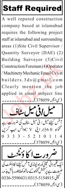 Private Company Islamabad, rawalpindi Islamabad Pakistan invites applications from eligible candidates for the post of machinery operator, machinery mechanic, accountant, site civil supervisor, civil construction foreman, building surveyor and office staff as per advertisement of November 20, 2023 published in daily Jang Newspaper. Preferred Education is B.com, Intermediate, Middle, Matric, Bachelor, DAE and BBA etc.