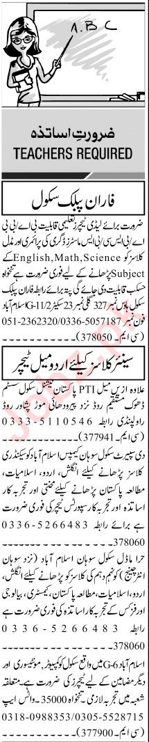 Private School jobs advertisement dated about 20 November 2023 in daily Jang Newspaper invites application for the vacant post of biology teacher, computer teacher, islamiat teacher, teacher, chemistry teacher, physics teacher, english teacher, sport teacher, science teacher, pakistan studies teacher, math teacher, montessori teacher, urdu teacher and lady teacher in Islamabad, rawalpindi Islamabad Pakistan. Persons with M.ed, Bachelor, Master, BA, MA, M.sc and B.ed etc. education can apply.