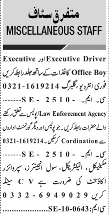 Private Company Lahore, lahore Punjab Pakistan invites applications from eligible candidates for the post of electrical engineer, civil engineer, driver, engineer, executive driver, accountant, mechanical engineer, office boy, executive office boy and supervisor as per advertisement of October 20, 2025 published in daily Jang Newspaper. Persons with B.com, Matric, DAE, BA, Bachelor and Intermediate etc. education can apply.