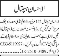 Vacant posts including receptionist are announced in Al Ihsan Hospital Saddar Rawalpindi, rawalpindi Punjab Pakistan as per 20 October 2025 advertisement in daily Jang Newspaper. Bachelor and Intermediate etc. educational qualification will be preferred.