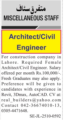 Construction Company Lahore, lahore Punjab Pakistan invites applications from eligible candidates for the post of civil engineer and architect as per advertisement of October 20, 2025 published in daily Jang Newspaper. Educational qualifications required Bachelor, Intermediate and DAE etc.
