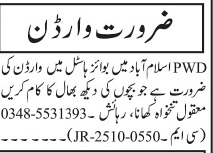 Hostel invites applications for job positions advertised in daily Jang dated 20 October 2025 for following vacancies in PWD Housing Scheme Islamabad, islamabad Islamabad Pakistan.
