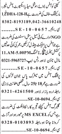 Private Company Gulberg Lahore, lahore Punjab Pakistan invites applications from eligible candidates for the post of office staff, marketing staff, office manager, personal assistant, pa, office boy, accountant and social media expert as per advertisement of October 20, 2025 published in daily Jang Newspaper. Educational qualifications required Matric, Bachelor, Intermediate, BA, Others and B.com etc.