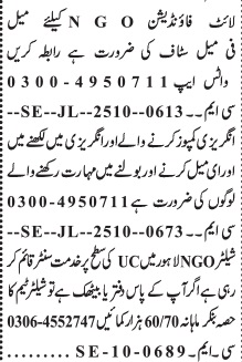 Non Governmental Organization NGO is looking for candidates for following posts as per job advertisement published in daily Jang Newspaper of October 20, 2025 for location Lahore, lahore Punjab Pakistan: