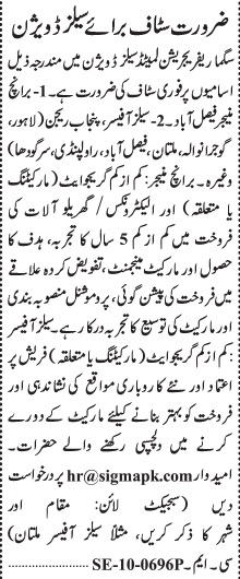 Sigma Refrigeration Ltd invites applications for job positions advertised in daily Jang dated 20 October 2025 for following vacancies in Lahore, faisalabad, gujranwala, rawalpindi, multan and sargodha Punjab Pakistan.