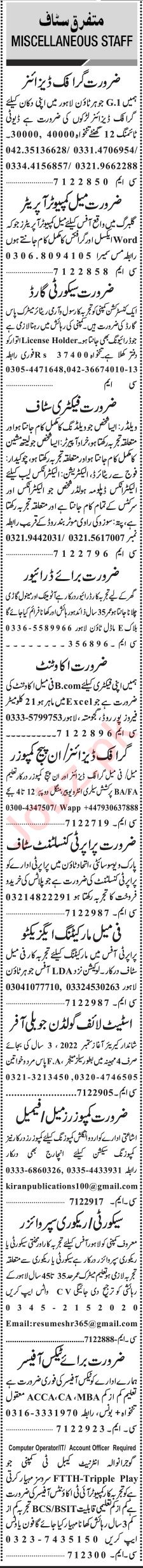 Vacant posts including accounts officer, chowkidar, graphic designer, security supervisor, computer operator, section incharge, factory staff, lathe machine operator, electrician, security guard, driver, recovery supervisor, tax officer, it officer, ltv driver, inpage composer, marketing executive, composer, accountant, property consultant staff and welder are announced in Private Company Lahore, lahore Punjab Pakistan as per 19 September 2022 advertisement in daily Jang Newspaper. Preferred Education is Matric, Intermediate, Bachelor and Middle etc.