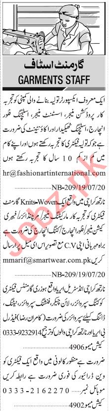 Jang Sunday Classified Ads 19th July 2020 for Garments Staff