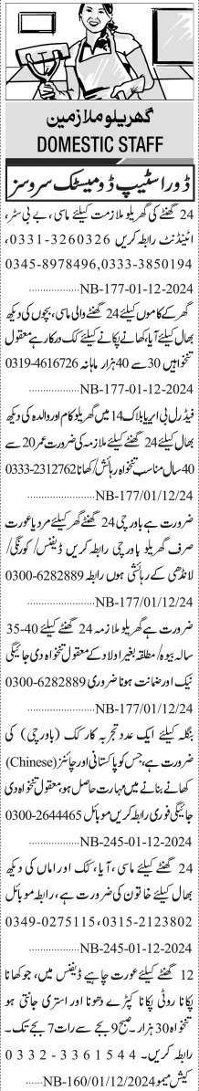 Jang Sunday Classified Ads 1st Dec 2024 for Domestic Staff
