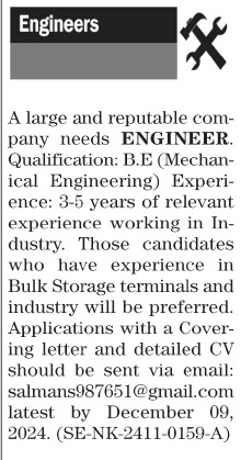 Latest Classifieds jobs in Engineering Company in Engineering and others can be applied till 9 December 2024 or as per closing date in newspaper ad. Read complete ad online to know how to apply on latest Engineering Company job opportunities.