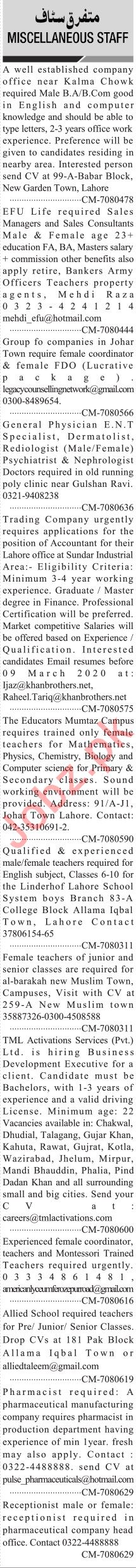 Jang Sunday Classified Ads 1st March 2020 For Admin Staff