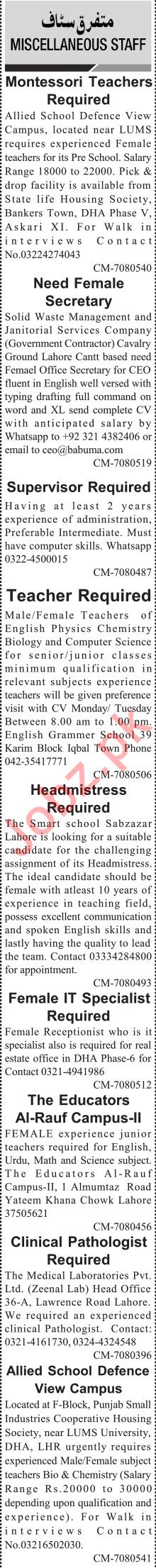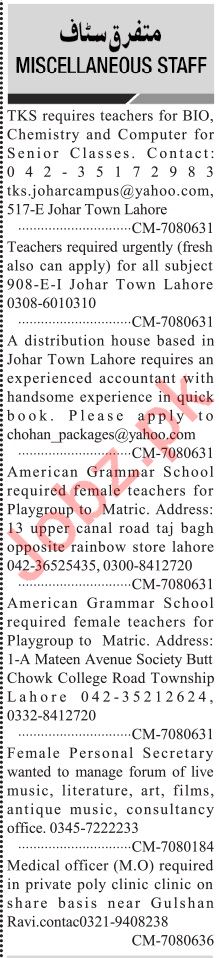 Assistant Supervisor, Account Manager, Teacher, English Teacher, Chemistry Teacher, Physics Teacher, Coordinator, Biology Teacher, Maths Teacher, Urdu Teacher, Art Teacher, English Teacher, Office Assistant, Salesman, Marketing Staff, Sales Staff, Computer Operator, Sales Manager, Sales Officer Nurse, Business Manager, Security Guard, Gynecologist, Lawyer, Assistant Accountant, Waiter, Batman seeks in well reputed companies.