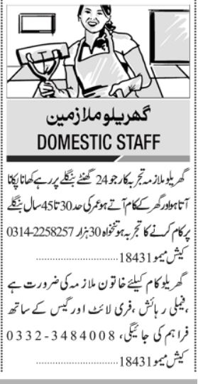 Jang Sunday Classified Ads 1st May 2022 For Domestic Staff