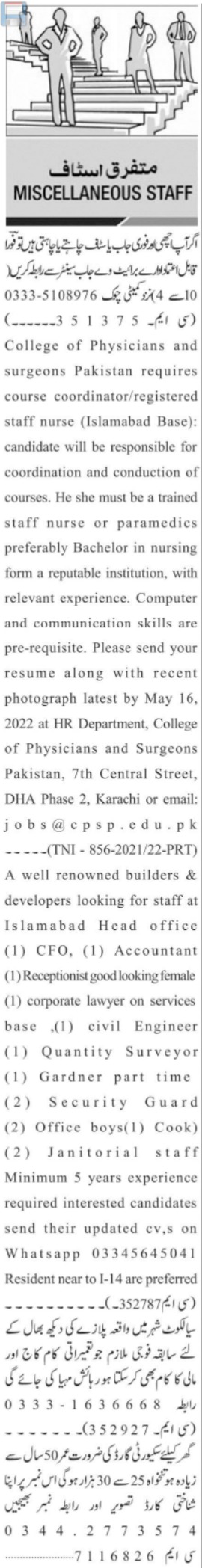 Vacant posts including watchman, chief financial officer, civil engineer, receptionist, staff nurse, cook, office boy, janitorial staff, lawyer, accountant, quantity surveyor, course coordinator, gardener, security guard, cfo, chef and nurse are announced in Private Company Rawalpindi, islamabad Punjab Pakistan as per 2 May 2022 advertisement in daily Jang Newspaper. Candidates with Bachelor, Middle, Matric and Intermediate etc. educational background will be preferred.