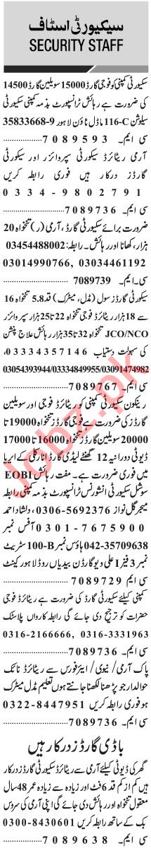 Jang Sunday Classified Ads 1st Nov 2020 For Security Staff