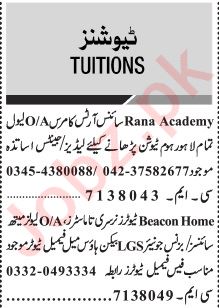 Private School Lahore, lahore Punjab Pakistan invites applications from eligible candidates for the post of math teacher, commerce teacher, science teacher, home tutor, o level teacher, teacher and a level teacher as per advertisement of October 2, 2023 published in daily Jang Newspaper. Persons with Master, M.sc, BA, MA and Bachelor etc. education can apply.