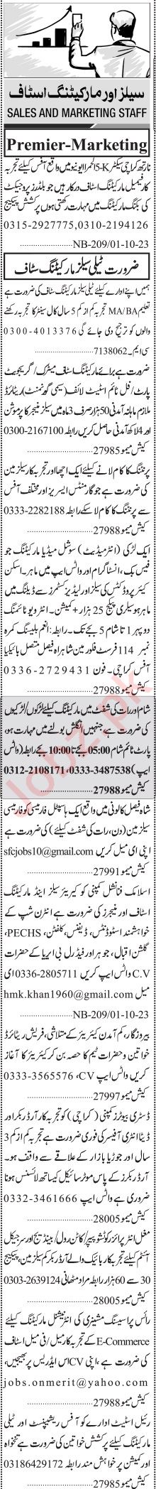 Jang Sunday Classified Ads 1st Oct 2023 For Sales Staff