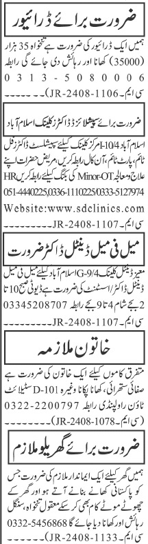 Vacant posts including doctor, ltv driver, aya, medical specialist, dentist, dental assistant, house worker, maid, driver, dental doctor and masi are announced in Private Company Islamabad, rawalpindi Islamabad Pakistan as per 2 September 2024 advertisement in daily Jang Newspaper. Educational qualifications required Middle, Bachelor, Intermediate, DAE, Matric, BA and BDS etc.