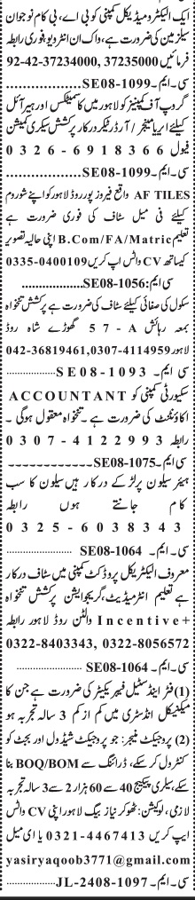 Private Company jobs advertisement dated about 2 September 2024 in daily Jang Newspaper invites application for the vacant post of area manager, female office staff, order taker, sweeper, beauty parlor staff, salesman, office staff, steel fabricator, project manager, hair stylist, fitter and accountant in Lalamusa, lahore Punjab Pakistan. Candidates with B.com, BA, Matric, Bachelor, DAE, Intermediate and Middle etc. educational background will be preferred.