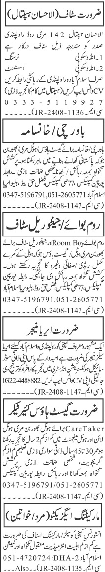 Private Company jobs advertisement dated about 2 September 2024 in daily Jang Newspaper invites application for the vacant post of cook, endoscopy assistant, marketing executive, area sales manager, sales staff, khansama, janitorial staff, endoscopy nurse, area manager, guest house caretaker, marketing staff and room boy in Islamabad, rawalpindi and murree Islamabad Pakistan. Preferred Education is Bachelor, I.com, Matric, BA, Middle and Intermediate etc.