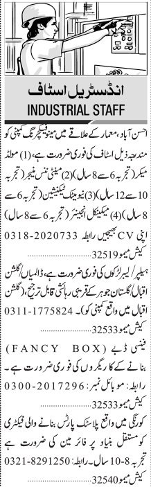 Jang Sunday Classified Ads 1st Sep 2024 for Industrial Staff