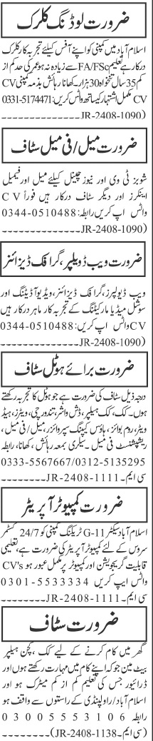 Private Company invites applications for job positions advertised in daily Jang dated 2 September 2024 for following vacancies in Islamabad, rawalpindi Islamabad Pakistan.