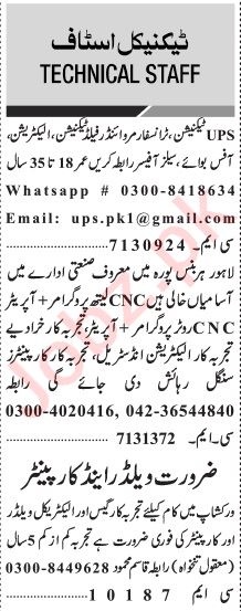 Private Industry Lahore, lahore Punjab Pakistan invites applications from eligible candidates for the post of office boy, sales officer, ups technician, carpenter, electrician, welder, cnc router operator, field technician, cnc router programmer, cnc lathe operator, industrial electrician, electrical welder, gas welder and cnc lathe programmer as per advertisement of April 3, 2023 published in daily Jang Newspaper. Candidates with Middle, Intermediate, Bachelor and Matric etc. educational background will be preferred.