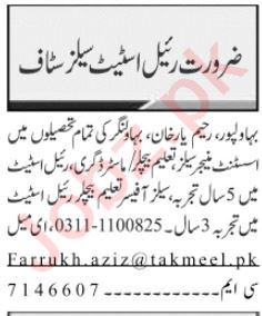 Real Estate Company is looking for candidates for following posts as per job advertisement published in daily Jang Newspaper of June 2, 2024 for location Bahawalpur, rahim yar khan and bahawalnagar Punjab Pakistan: