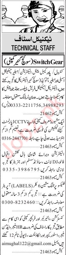 Manufacturing Company jobs advertisement dated about 3 October 2022 in daily Jang Newspaper invites application for the vacant post of store keeper, admin manager, cctv technician, accountant, electrician, helper, mechanical technician, interior designer, electrical technician, power cable panel electrician, printing machine operator and hr manager in Karachi, karachi Sindh Pakistan. Matric, Middle, Bachelor and Intermediate etc. educational qualification will be preferred.