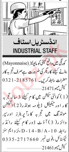 Private Industry Karachi, karachi Sindh Pakistan invites applications from eligible candidates for the post of rider, factory worker, supervisor and injection molding operator as per advertisement of October 3, 2022 published in daily Jang Newspaper. Intermediate, Middle, Bachelor and Matric etc. educational qualification will be preferred.