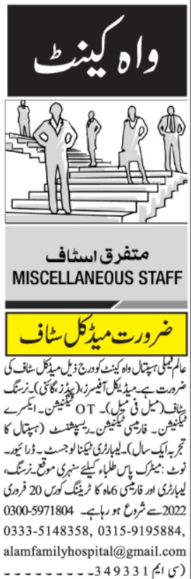Alam Family Hospital invites applications for job positions advertised in daily Jang dated 20 February 2022 for following vacancies in Wah Cantt, wah cantt Punjab Pakistan.