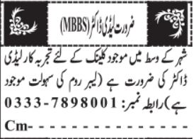 Vacant posts including lady doctor, doctor and mbbs doctor are announced in Hospital Clinic Quetta, quetta Balochistan Pakistan as per 21 March 2022 advertisement in daily Jang Newspaper. Candidates with MBBS etc. educational background will be preferred.