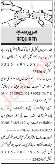 Vacant posts including baby sitter, nurse, worker, house maid, painter and attendant are announced in Private Company Karachi, karachi Sindh Pakistan as per 21 November 2022 advertisement in daily Jang Newspaper. Candidates with Matric, Intermediate and Middle etc. educational background will be preferred.