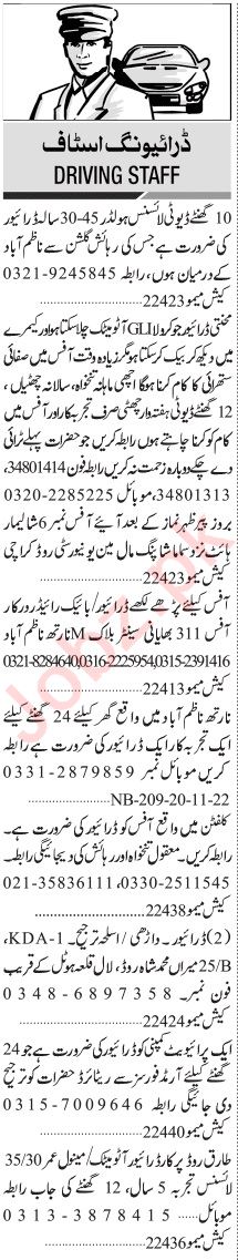 Jang Sunday Classified Ads 20 Nov 2022 For Driving Staff