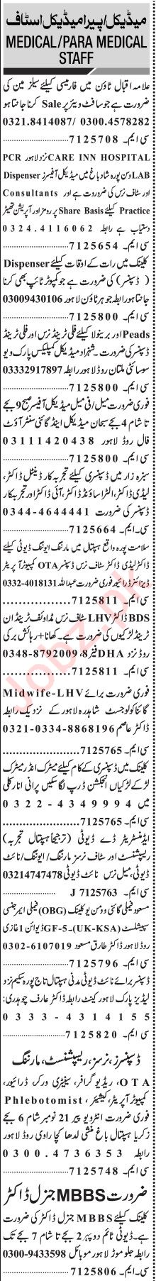 Hospital Clinic Lahore, lahore Punjab Pakistan invites applications from eligible candidates for the post of dispenser, driver, medical consultant, nurse, receptionist, mbbs doctor, midwife, phlebotomist, dental doctor, lhv, computer operator, pharmacy salesman, lady doctor, gynecologist, staff nurse, ota, designer, doctor, salesman, sanitary worker, emergency specialist, radiographer, ultrasound doctor, male nurse, cashier, eye doctor and medical officer as per advertisement of November 21, 2022 published in daily Jang Newspaper. Preferred Education is Bachelor, BCS, Intermediate, Others, Matric, DAE and MBBS etc.