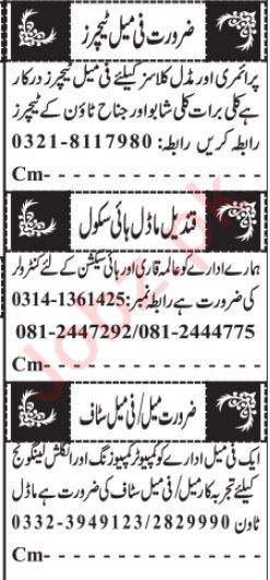 Private Company jobs advertisement dated about 22 April 2024 in daily Jang Newspaper invites application for the vacant post of qari, teacher, primary teacher, female teacher, english language teacher and computer composer in Quetta, quetta Balochistan Pakistan. Intermediate, BA, Bachelor and MA etc. educational qualification will be preferred.