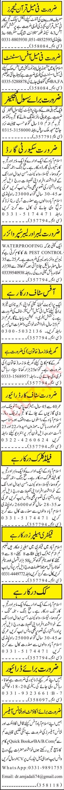 Private Company jobs advertisement dated about 22 August 2022 in daily Jang Newspaper invites application for the vacant post of sales staff, house worker, factory helper, female office assistant, teacher, labor supervisor, civil engineer, engineer, office staff, cook, labor, account officer, clerk, security guard, finance officer, field clerk, quran teacher, driver, staff car driver, office assistant and car driver in Rawalpindi, islamabad Punjab Pakistan. Educational qualifications required Matric, Bachelor, Middle and Intermediate etc.