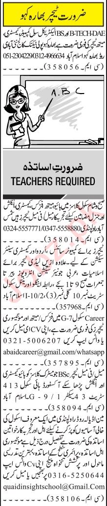 Vacant posts including maths teacher, computer teacher, physics teacher, islamiat teacher, arabic teacher, teacher, chemistry teacher, montessori teacher, computer science teacher, urdu teacher, electrical engineering teacher, female teacher and english teacher are announced in Private School Islamabad, islamabad Islamabad Pakistan as per 22 August 2022 advertisement in daily Jang Newspaper. Candidates with Bachelor and Master etc. educational background will be preferred.
