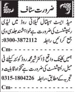 Hospital Clinic invites applications for job positions advertised in daily Jang dated 21 January 2024 for following vacancies in Quetta, quetta Balochistan Pakistan.