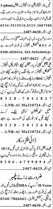 Vacant posts including electrician, plumber, motor winder, electrical engineer, mechanical engineer, civil engineer, die fitter, engineer and steel fabrication foreman are announced in Private Industry Lahore, lahore Punjab Pakistan as per 22 July 2024 advertisement in daily Jang Newspaper. Intermediate, Matric, DAE, Bachelor and B.E etc. educational qualification will be preferred.
