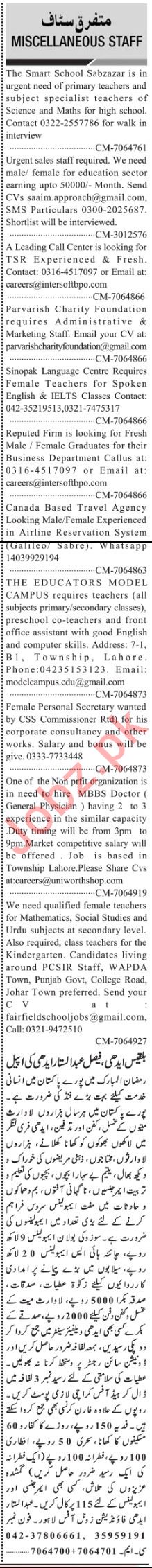 Jang Sunday Classified Ads 21st April 2019 General Staff