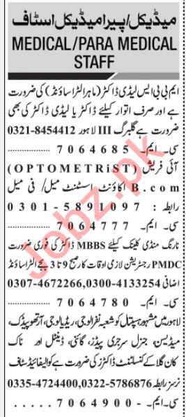 ENT Specialist, Eye Specialist, Child Specialist, Medical Officer, Radiologist, Nurse, LHV, Doctor, Lady Doctor, Pharmacist, Midwives, Gynecologist, Receptionist, Dispenser, Resident Medical Officer, Pathologist, General Manager, Admin Assistant, Executive Officer, Manager Housekeeping, Assistant Chemist, ICU Technician, CT Scan Technician needs in well reputed hospitals.