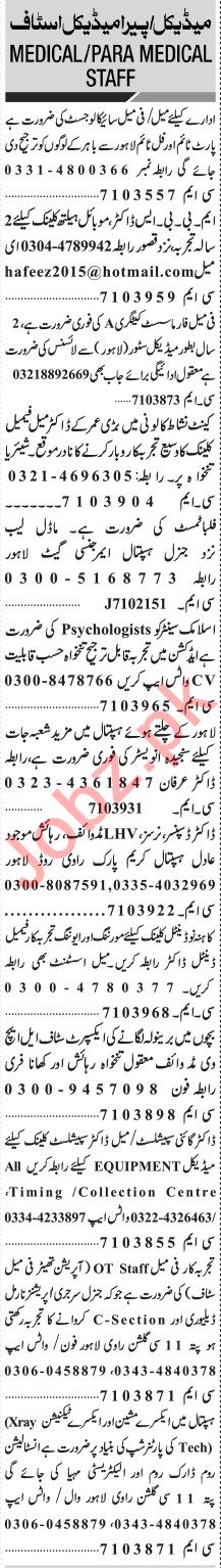 Medical Officer, Radiologist, Nurse, LHV, Doctor, Lady Doctor, Pharmacist, Midwives, Gynecologist, Receptionist, Dispenser, Resident Medical Officer, Pathologist, General Manager, Admin Assistant, Executive Officer, Manager Housekeeping, Assistant Chemist, ICU Technician, CT Scan Technician, X Ray Technician needs in well reputed hospitals.