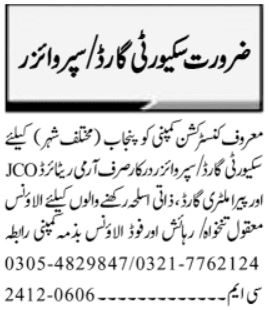onstruction Company jobs advertisement dated about 23 December 2024 in daily Jang Newspaper invites application for the vacant post of security guard and supervisor in Multan, multan Punjab Pakistan. Educational qualifications required Intermediate, Middle and Matric etc.