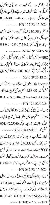 Jang Sunday Classified Ads 22 Dec 2024 for Medical Staff