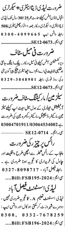 Private Company is looking for candidates for following posts as per job advertisement published in daily Jang Newspaper of December 23, 2024 for location Lahore, faisalabad Punjab Pakistan: