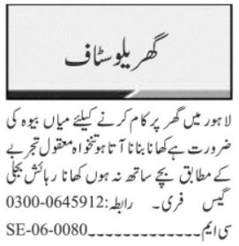 House Lahore, lahore Punjab Pakistan invites applications from eligible candidates for the post of house worker, house staff and husband wife as per advertisement of June 23, 2025 published in daily Jang Newspaper. Primary and Middle etc. educational qualification will be preferred.