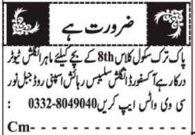 Apply as per details in job advertisement. Login to view further details of how to apply via https://www.jobz.pk online.